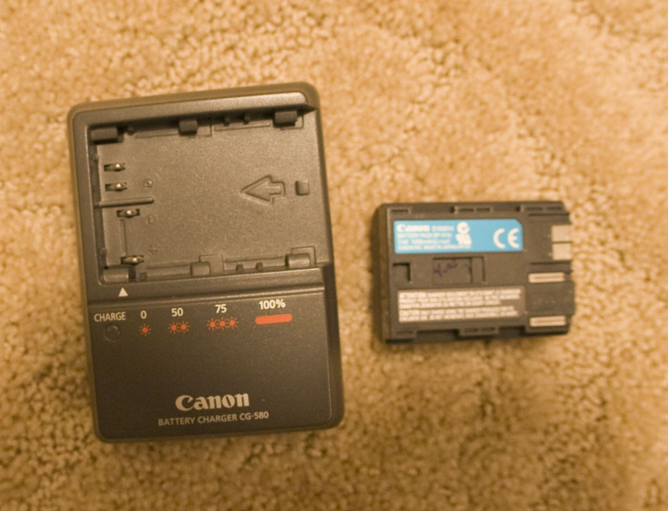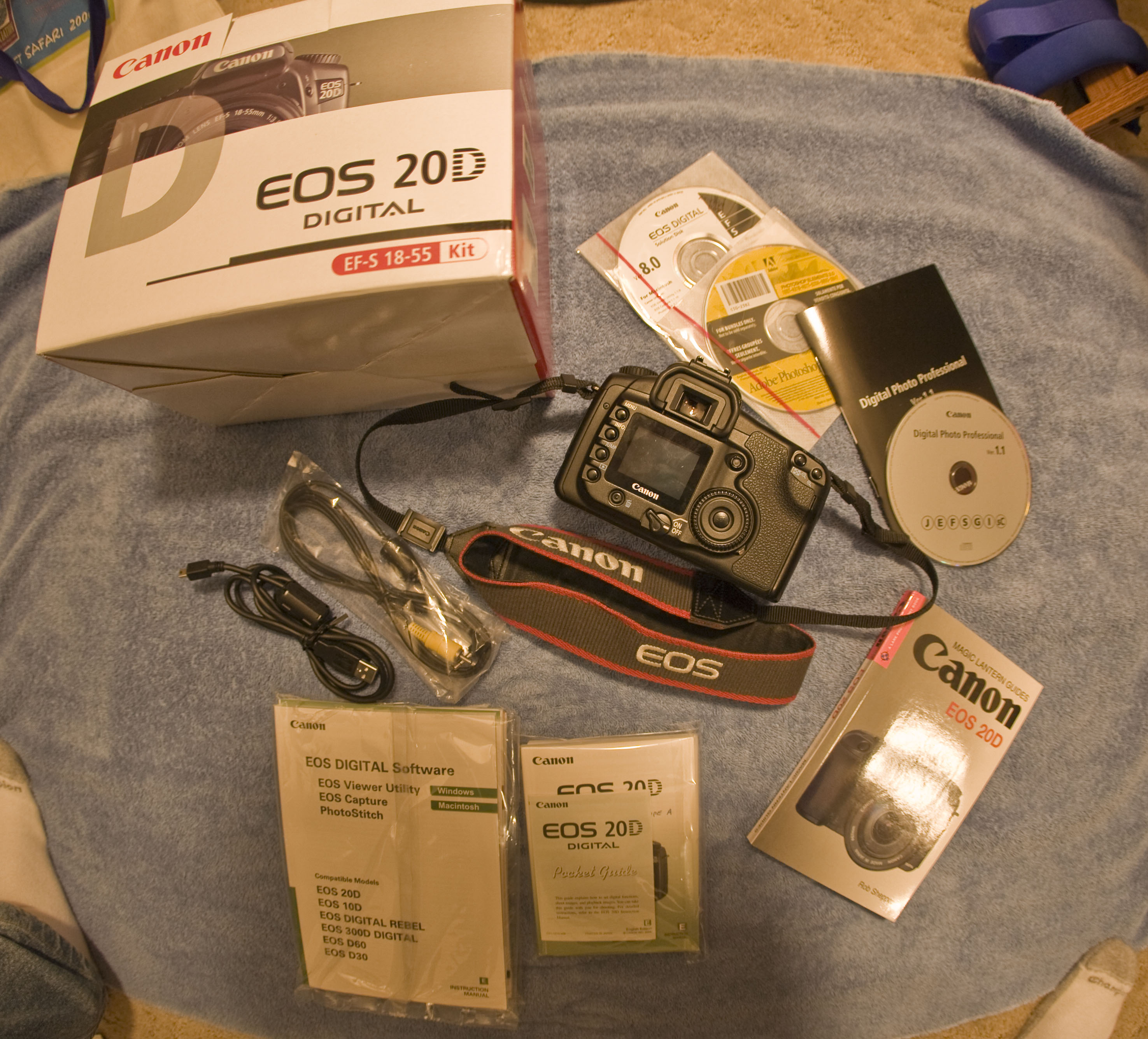 Comes with Original packaging, Manuals, Pocket Guide, Canon logo wide neck strap, CG580 battery charger, Battery BP-511A, Eyecup, Cables: video, USB interface. SW: Canon Digital Photo Professional V1.1; Adobe Photoshop Elements 2.0; Canon EOS Digital Solution Disk V8.0 (The latest versions of all included Canon brand software can be downloaded from canon.com at http://tinyurl.com/yvce2h ). As far as I can tell I have everything the camera came with.