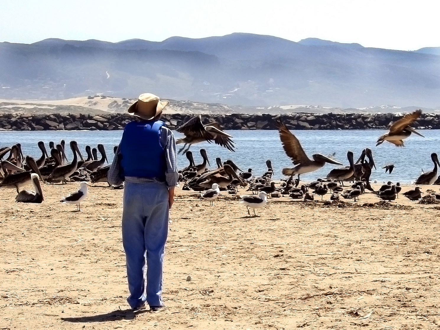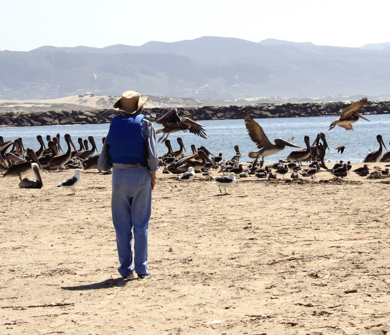 Pelicans in the surf, in the air, and on the beach. With camera ready, I