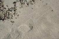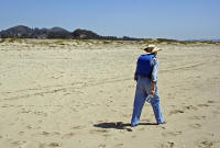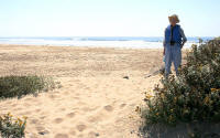 Bev walking to the ocean on the sandspit | Bev discovers bird prints in the sand on the ocean side of the sandspit | Bev heads for the rock jetty on ocean side of the sandspit |