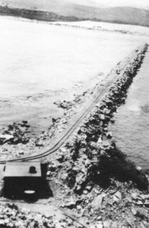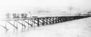 1910. Trestle with railroad tracks to quarry on Morro Rock, from shore.