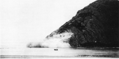 Early 1890s. Blasting of the east face of Morro Rock. Photo from