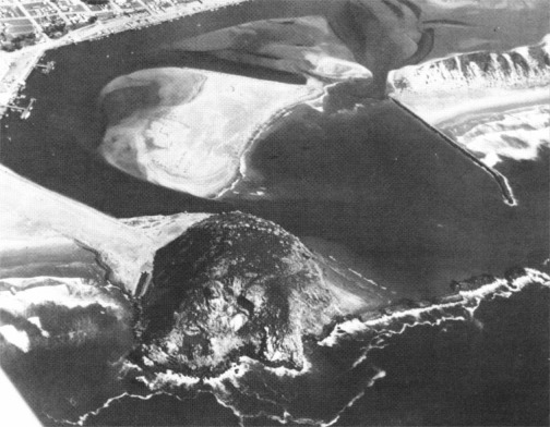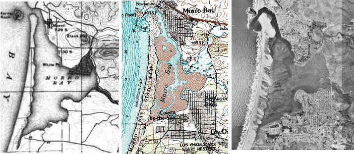 The above composite shows how Morro Bay (including the separation of Morro Rock from the mainland) has changed over the years. The left-most image is from an 1897 topographic map; the center image is from a 1981 topographic map; and the right-most image is from a 1994 satellite photograph. You will note that originally, Morro Rock was an island, and the sand spit to the south was fairly narrow and straight. After the north entrance of the bay was closed in the 1930-40's (see "progress" below), sea breaks built in the 1950's, and the harbor dredged, the sand spit took on its present form, drifting significantly to the east at its northern end. Note also the increase in the sedimentation in the bay. In 1897, the salt marsh leading out of Chorro creek formed an area much smaller than it is today. Within a couple of hundred years, the entire bay could be compromised by uncontrolled sedimentation. You can move your mouse over the above map top find "hot sport" which will take you to higher resolution images of the areas marked. (To download a "super-sized" version of the 1897 topographic map for printing, click here.)