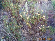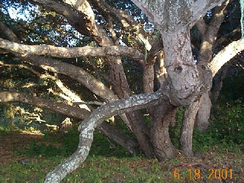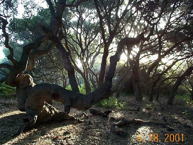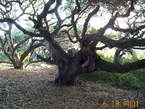 Introduction, from Los Osos - Baywood Park Chamber of Commerce: Watch for small signs and a parking lot on the south side of Los Osos Valley Road, ½-mile east of South Bay Boulevard. An easy one-mile trail leads visitors under the low canopy of "Pygmy Oaks," dwarfed oaks that are 600 to 800 years old. The leaf-covered trail winds among the trees' gnarled gray trunks and the mushrooms, wild cucumbers, hollyleaf cherry and other flora that exist in this shaded land where Chumash Indians once lived. Visitors should be wary of a prolific member of the reserve's plant community - poison oak. Avoid its shiny "leaves of three" lining the trail in many places. |