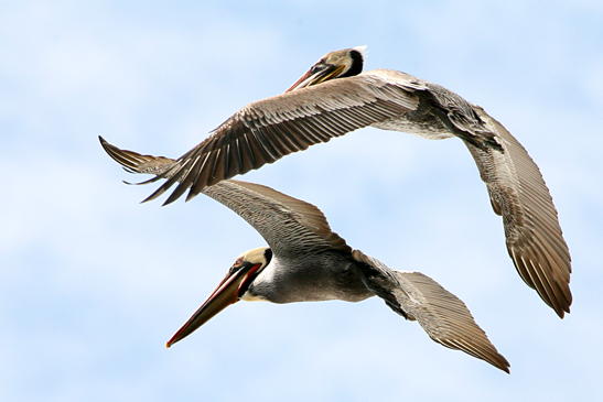These two Brown Pelicans (Pelecanus occidentalis), exhibiting the bright plumage typical of of breeding adults, were observed among a flock of 20 off Morro Rock on January 15, 2006. Brown Pelicans have made an amazing recovery from when they were first listed as endangered in the entire U.S. in June 2, 1970, and they are now frequently seen in Morro Bay. They are still listed as endangered in the entire range, except for the Atlantic coast of the United States, Florida and Alabama, where they were delisted in Feb. 4, 1995 due to recovery. Populations in California, Texas, and Louisiana were decimated in the U.S. by pesticides (DDT and related compounds) in the 1950s and 60s. Brown Pelicans hunt fish with spectacular twisting plunge-dives from the air. This species can reach up to 8 pounds and larger individuals have a wing spread of over 7 feet.